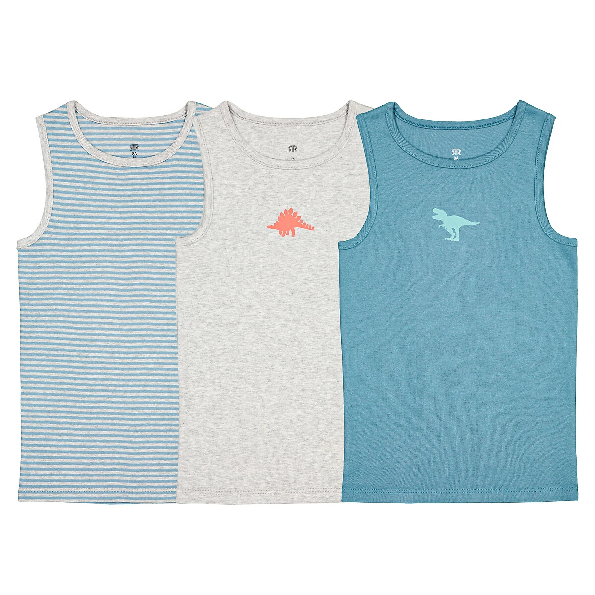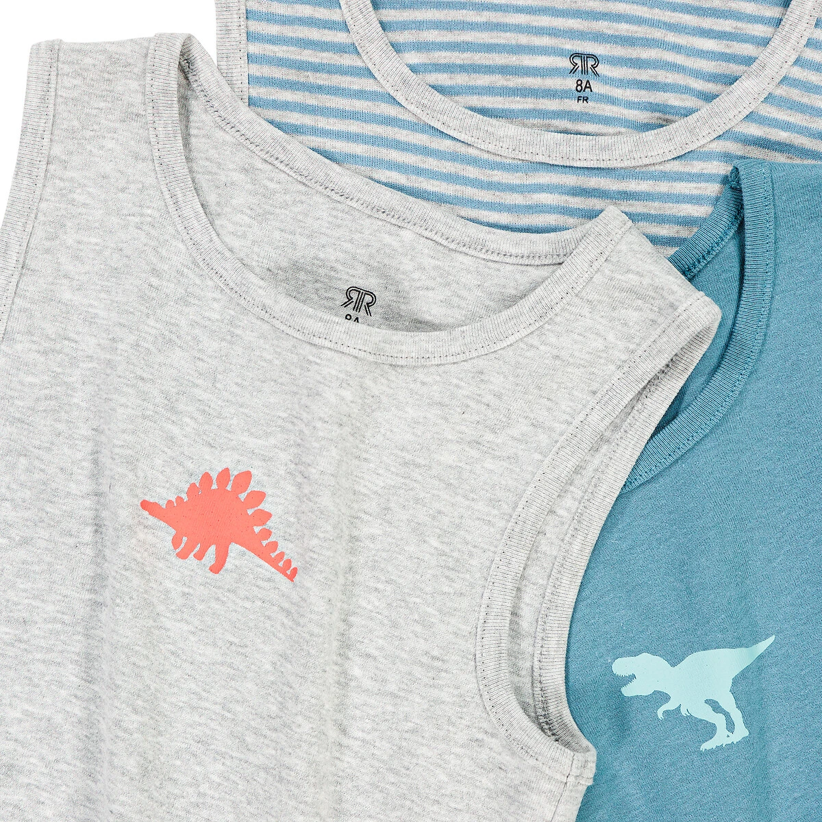 • Lot de 3 débardeurs : 1 rayé + 2 unis avec motif « dinosaure » imprimé devant